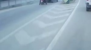 #Antalya'da iki kamyonet arasından geçmeye çalışan motokurye, sarkan branda ipine takılarak yola savruldu. Kamyonet teke...