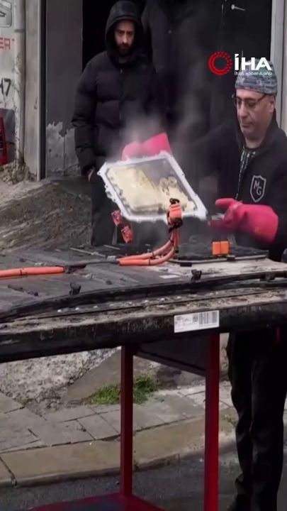 Sarıyer'de bir oto tamir servisinde elektrikli bir aracın batarya bölümünde bir anda alev parladı.