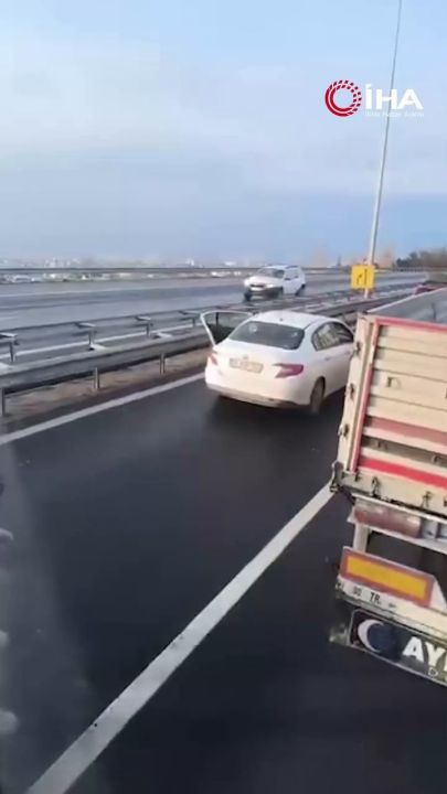 Büyükçekmece’de bir sürücü trafikte emniyet şeridini kullanamayınca kendisine yol vermeyen sürücüye küfür edip aracını yumrukladı.