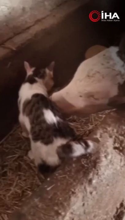 Bağlı olan arkadaşı buzağıyı sürekli ziyaret eden kedinin halleri gülümsetti