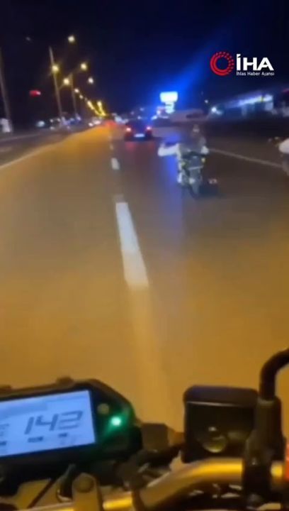 Bursa’da motosikletin üzerine yatarak yarış yapan iki sürücü, yürekleri ağza getirdi.