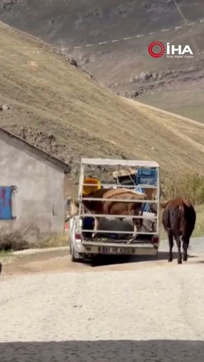 Gümüşhane Taşköprü Yaylası'nda birlikte otlayan iki inekten biri, sezonun sona ermesiyle köye götürülmek üzere kamyonete yüklenirken, geride kalan inek arkadaşını son bir kez görmek istercesine kamyonetin arkasından koştu.