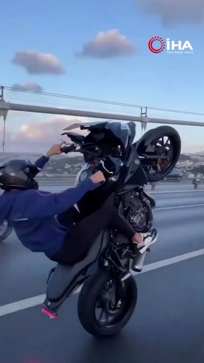 Seyir halindeki bir motosikletli köprü üzerinde ön kaldırarak ilerledi.