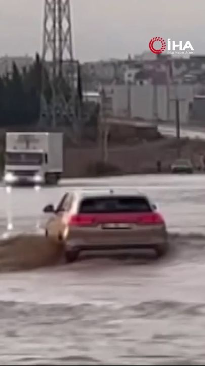 #Adana'da şiddetli yağış sonucu oluşan su birikintisinden araçlar geçemezken bir TOGG suların içinde ilerledi.