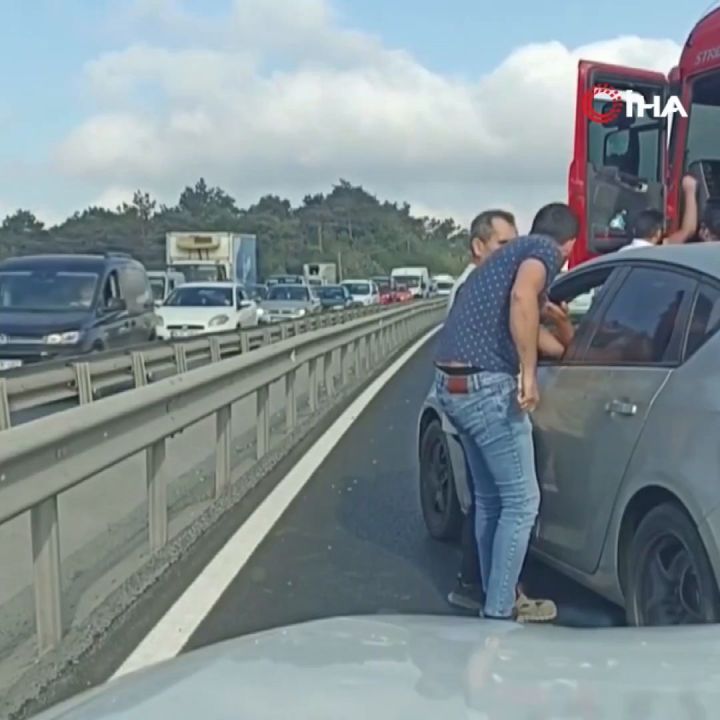 İstanbul Arnavutköy yolunda bir hafriyat kamyonu sürücüsü ile bir otomobilin sürücüsü iddiaya göre yol verme nedeniyle tartışma yaşadı. Trafiği ortasında, araçları durdurup kavga eden sürücüleri, yol üzerinden geçen vatandaşlar güçlükle ayırdı.