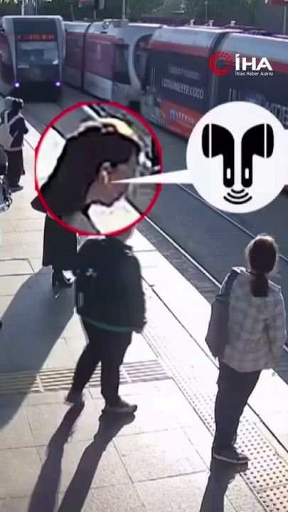 Kayseri'de tramvayın geldiğini fark etmeyen genç kızı, son anda güvenlik görevlileri kurtardı.